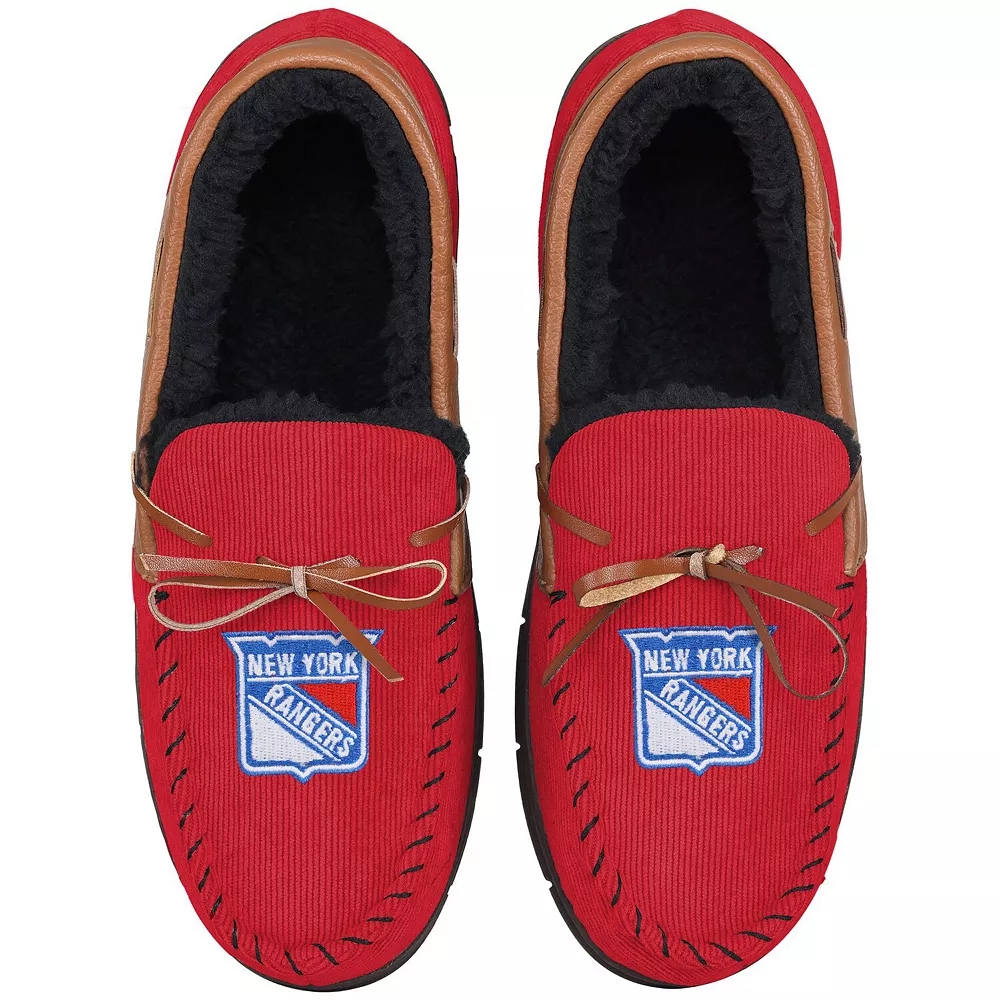 Whether watching the New York Rangers or enjoying a night in, stay comfortable with these Corduroy moccasin slippers. These FOCO slippers feature a faux fur lining and embroidered team graphics, perfect for adding New York Rangers fandom whenever worn.